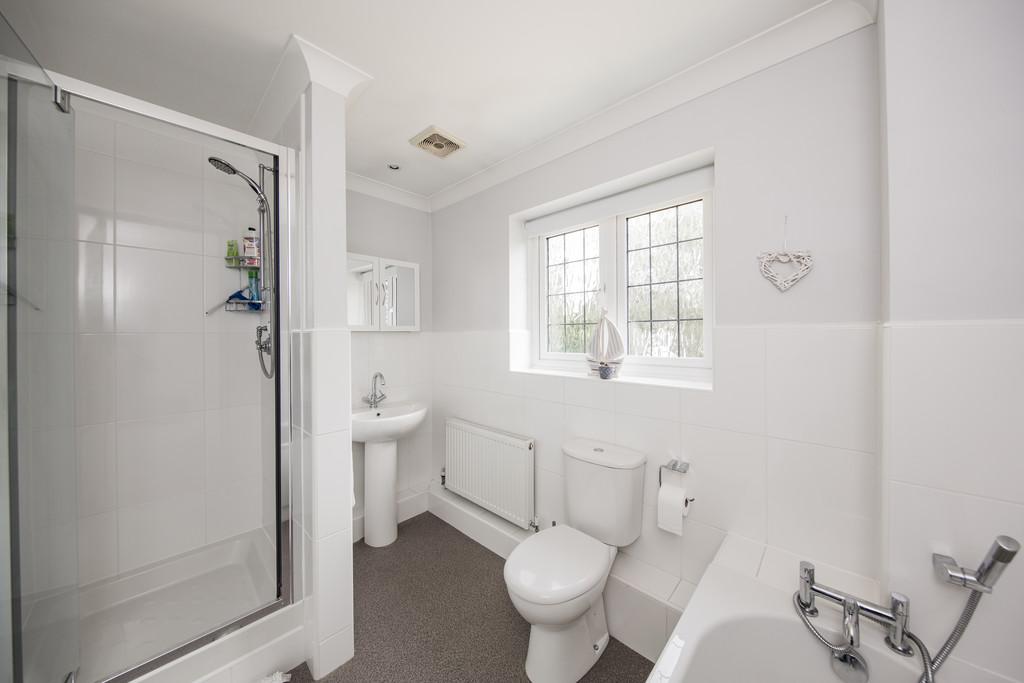 FAMILY BATHROOM: Built-in tiled enclosure with integrated shower, panelled bath with shower attachment over, dual flush low level wc, pedestal wash basin, radiator and obscured window to front.