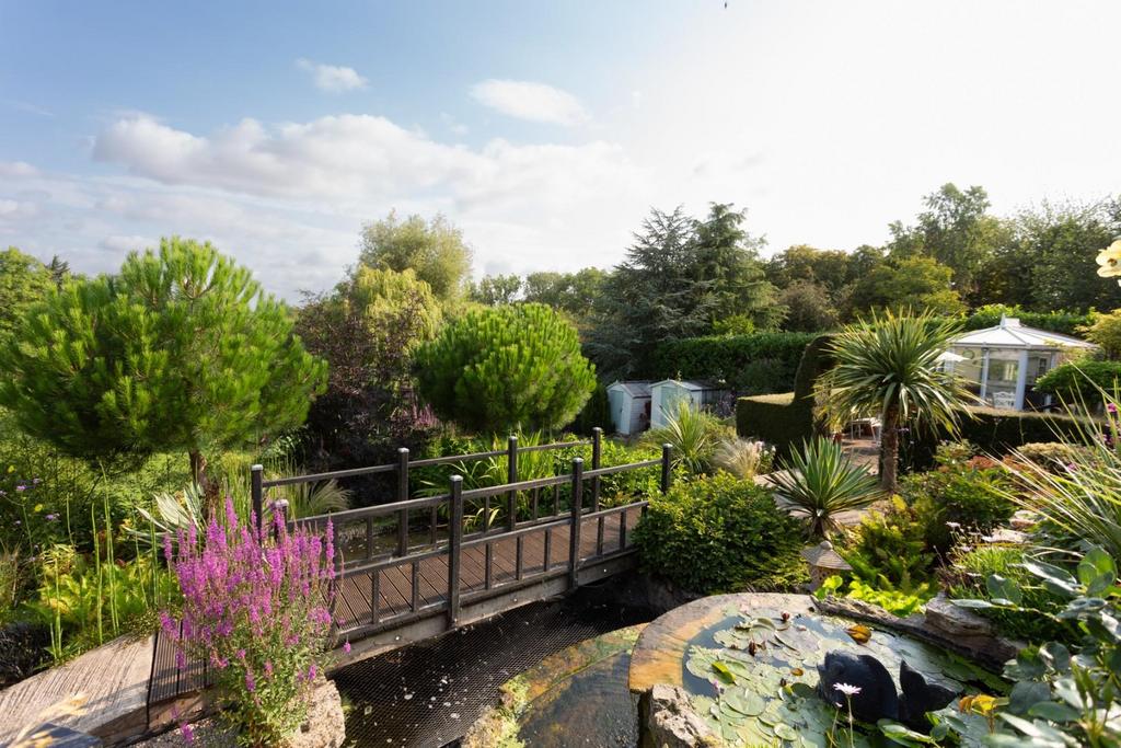 A series of beautifully designed terraces and pathways wind through manicured lawns, vibrant planting schemes, and carefully curated seating areas, all thoughtfully positioned to take full advantage of the views over the extended gardens beyond. At the center, a circular lawn with a neatly clipped hedge and ornamental tree creates a focal point, while nearby patios and suntraps offer perfect spots for al fresco dining or quiet reflection. Further into the garden, a charming footbridge spans a decorative water feature, leading to a secluded section planted with plants and shrubs with a concrete pathway leading to the paddock land and beyond. Discreetly nestled among the mature borders, a summerhouse and various seating areas provide quiet retreats throughout the garden. This is a space of exceptional quality and vision — not merely an extension of the home, but a lifestyle offering privacy, tranquility, and an outdoor environment rarely found in such a setting.