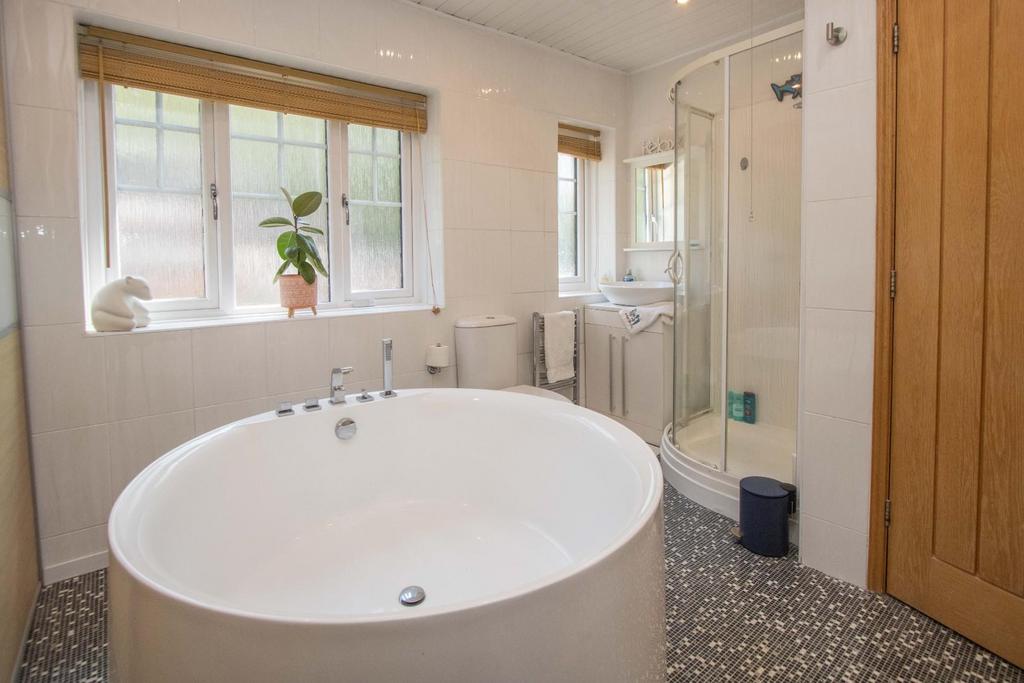 Upstairs, the first floor has three generous bedrooms, each offering a serene retreat for rest and relaxation. The rear bedrooms capture the beauty of the surrounding countryside, making mornings just that little bit more magical. The family bathroom is thoughtfully appointed with a plunge-style bath, a separate shower cubicle, a sleek wash basin, WC, and discreet built-in storage. The loft is partially boarded for storage — and, with the right permissions, offers potential to extend.