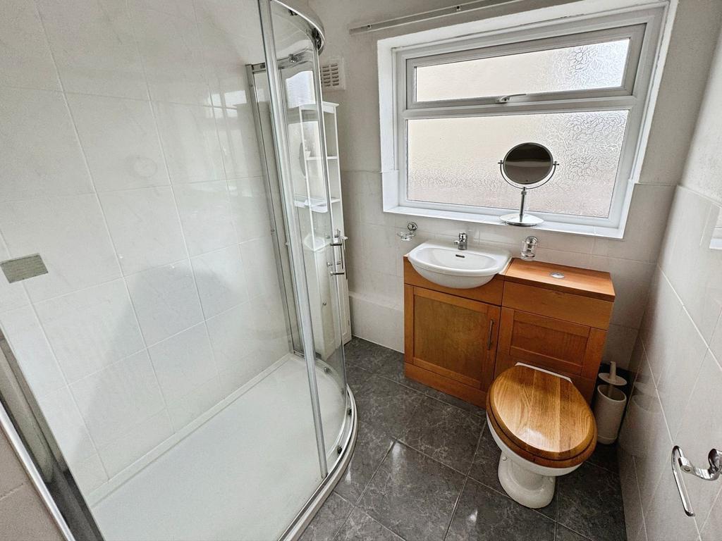 Shower, sink and WC. Window to the side aspect. Tiled flooring.