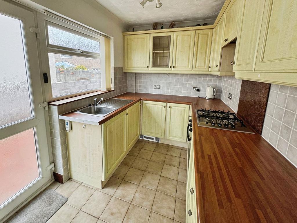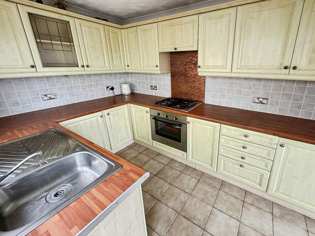A range of matching base and wall units with complimentary worktops. Sink and drainer,, hob and oven, integral fridge and washing machine. Window to the side aspect. Door to the driveway. Tiled flooring.