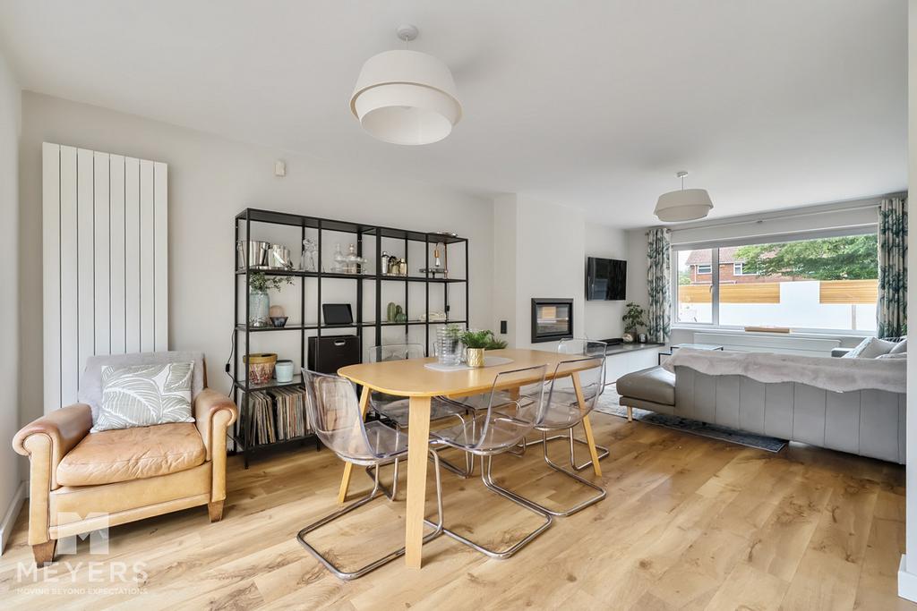 The welcoming entrance hall features bespoke fitted storage and a modern cloakroom, offering a smart and functional introduction to the home. From here, the property opens into an expansive open plan living and dining area, beautifully finished with Karndean flooring and a contemporary media plinth with inset gas fire. Two sets of wide aluminium bi fold doors lead out to the rear garden, allowing natural light to flood the space and creating an effortless connection between indoors and outdoors.