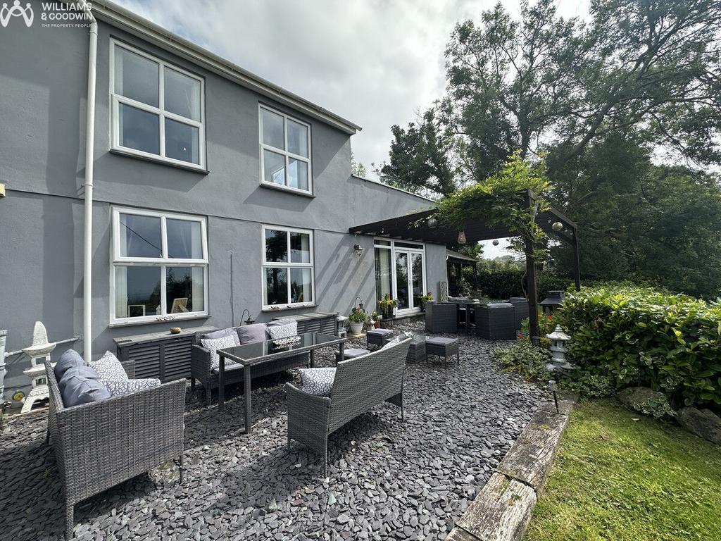 The large detached family home occupies a extensive plot with sweeping gardens, a long driveway track leading to the property from the road and a patio seating area.