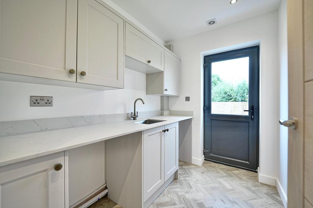 The adjacent utility room which has been fitted to complement the kitchen with quartz counters and undercounter sink, plumbing for washing machine, space for dryer and door to the side garden.