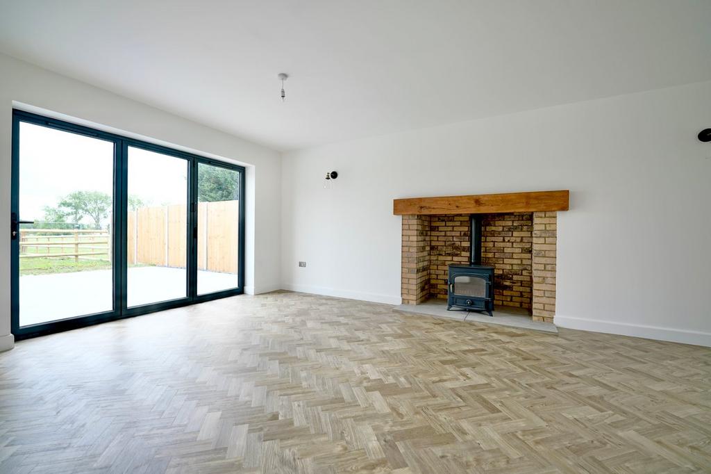 The spacious, dual-aspect formal living room has an attractive brick fireplace with tiled hearth and oak bressummer incorporating a wood burning stove, along with bi-folding doors which open onto the garden.