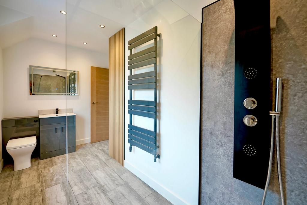 • Air-source heat pump with underfloor heating downstairs and double-column radiators to first floor.