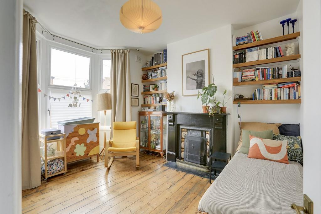 Double-glazed bay windows, pendant ceiling, fireplace, radiator, wood flooring.