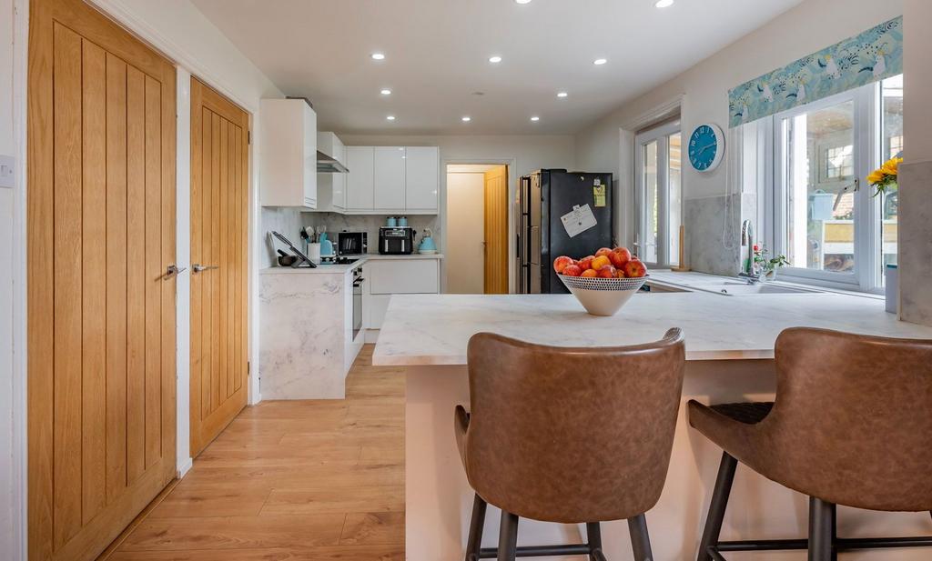 The ground floor features an impressive open-plan kitchen/dining room that flows seamlessly into a spacious, dual-aspect lounge – perfect for modern family living and entertaining. A separate second reception room offers further flexibility as a snug, playroom or home office. Completing the ground floor is a cloakroom/WC.