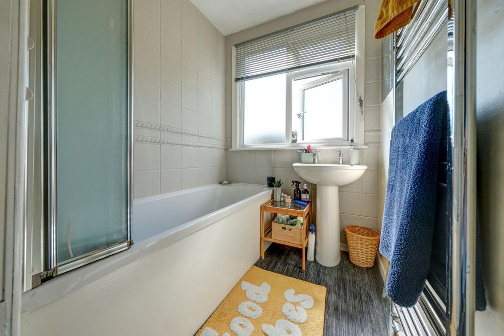 Comprising panel enclosed bath with Mira shower and glazed screen, wash hand basin, chrome ladder style central heating radiator, Vinyl flooring, part tiled walls, window to the front elevation and cupboard housing Worcester central heating boiler.