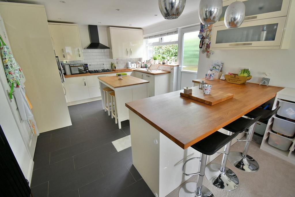 • The kitchen/breakfast area incorporates ample woodblock worktops which continues round to form a breakfast bar, a good range of base and wall units with underlighting, excellent range of integrated appliances to include Bosch 5 ring gas hob with extractor canopy above, Bosch oven and grill above, integrated fridge freezer, dishwasher and washing machine, attractive tiled splashbacks, tiled floor and double glazed door leading out onto a side path