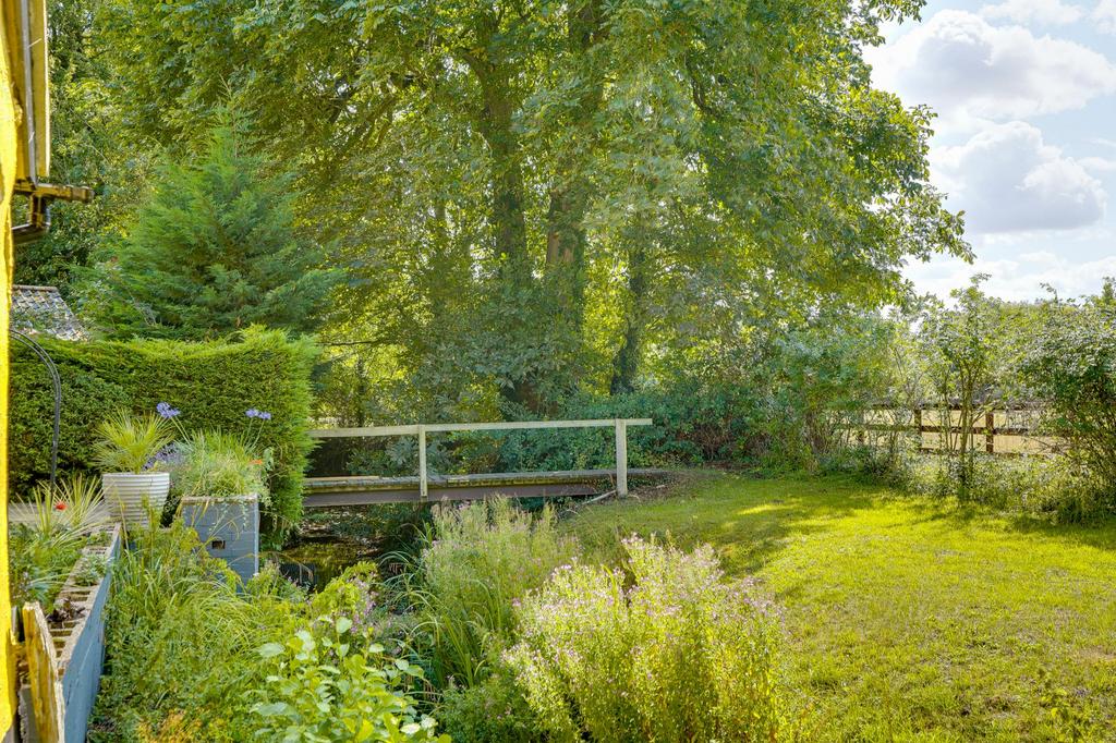 Accessed via a private driveway, the property includes a detached garage with an adjoining lean-to car port. The generous wraparound gardens are mainly laid to lawn and enjoy a south-westerly orientation, bordered by mature trees such as apple and horse chestnut, ensuring excellent privacy. To the rear, a paved terrace overlooks a charming brook and open meadowland, with a wooden footbridge crossing the water to a further lawned area—an idyllic outdoor retreat.