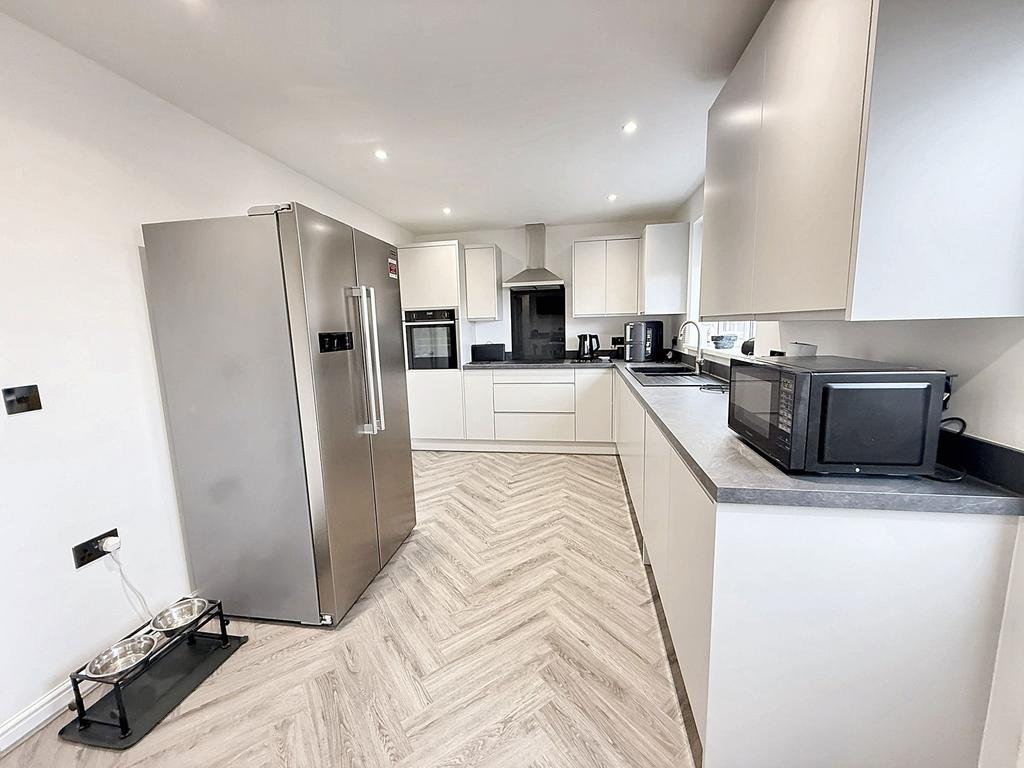 A stunning, contemporary kitchen/diner, recently installed by the current owner, offering both style and practicality. The kitchen features a range of sleek, matt-finish grey wall and base units with contrasting worktops and upstands, complemented by a striking herringbone-style LVT floor. Integrated appliances include an electric oven, induction hob with stainless steel extractor, dishwasher, and washing machine, along with an inset 1.5 bowl composite sink and mixer tap. There is also space for a fridge freezer.