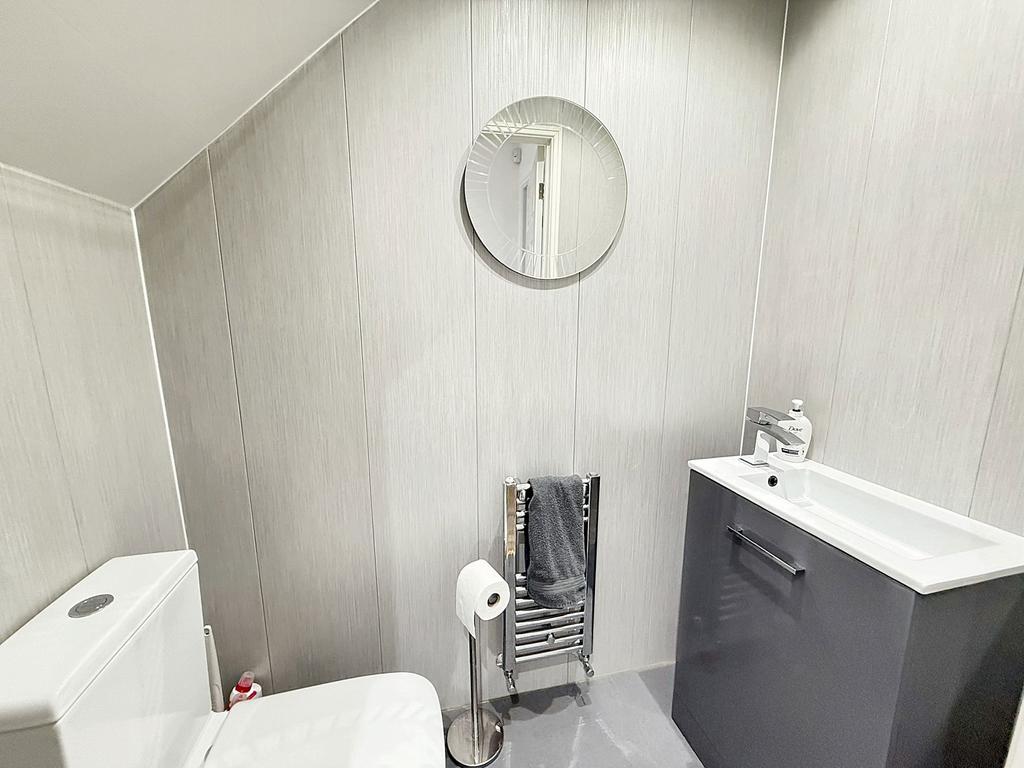 Recently upgraded by the current owner, the downstairs cloakroom features a WC and vanity hand basin, complemented by a chrome towel radiator and extractor fan. The walls are attractively clad, and the space is finished with a practical vinyl floor.