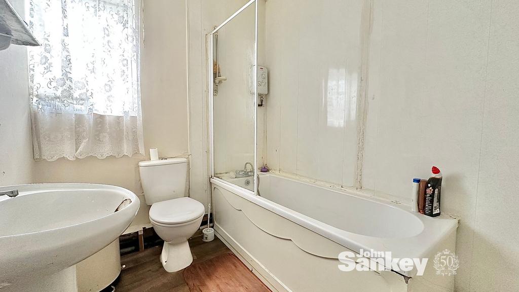 The bathroom includes a low flush WC, a pedestal sink, and a bath. A UPVC double glazed window faces the rear and there is also a central heating radiator.