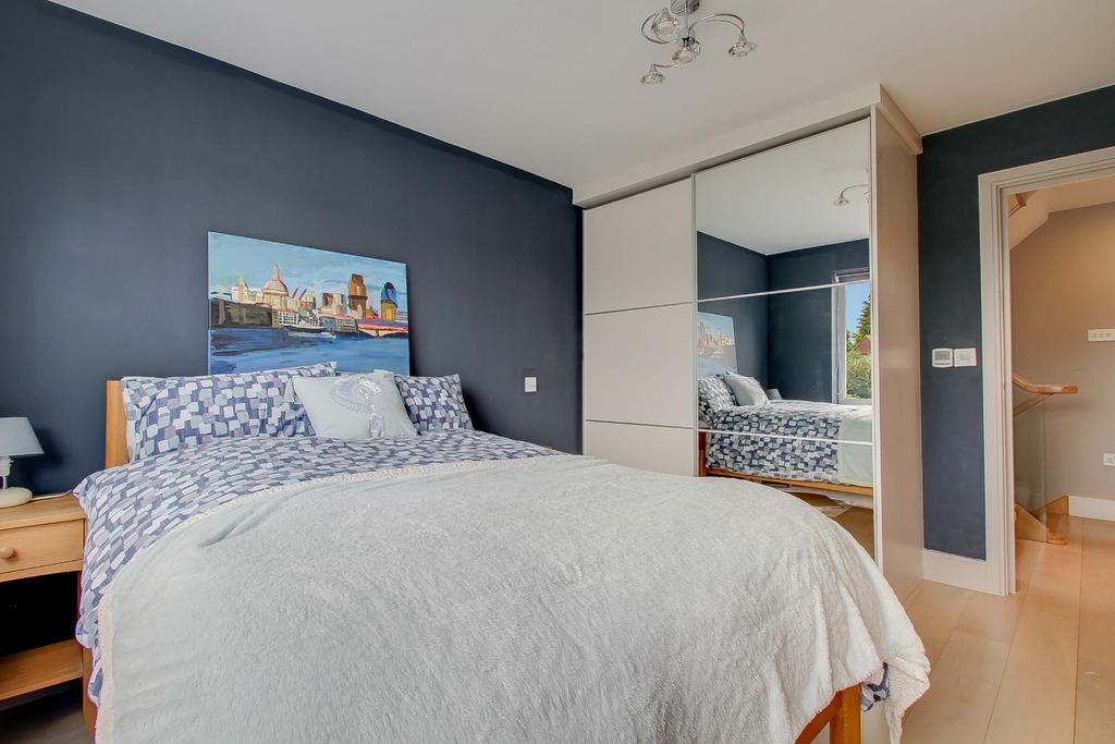 Top Floor: Show-Stopping Views & Private Terrace, The top floor offers two exceptional rooms. The main bedroom boasts floor-to-ceiling mirrored wardrobes with deep eaves storage, and double-aspect windows that frame the full sweep of the Thames, Marlow Lock, Winter Hill, and even the iconic “pink house.”