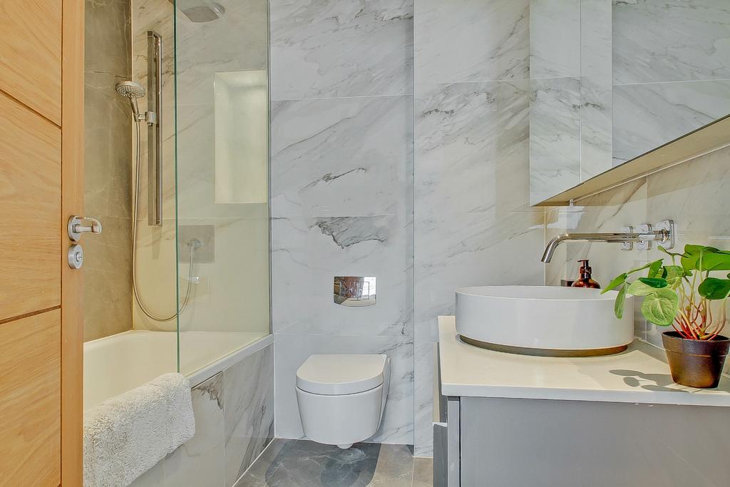 Second Floor: Three Bedrooms & Spa-Like rain showers, The second floor hosts three spacious double bedrooms, including a luxurious primary suite with spectacular river views, a generous dressing area, and a beautifully appointed en-suite finished in large-format white and grey marble tiles. A family bathroom with similarly refined finishes and a shower-over-bath completes this floor.