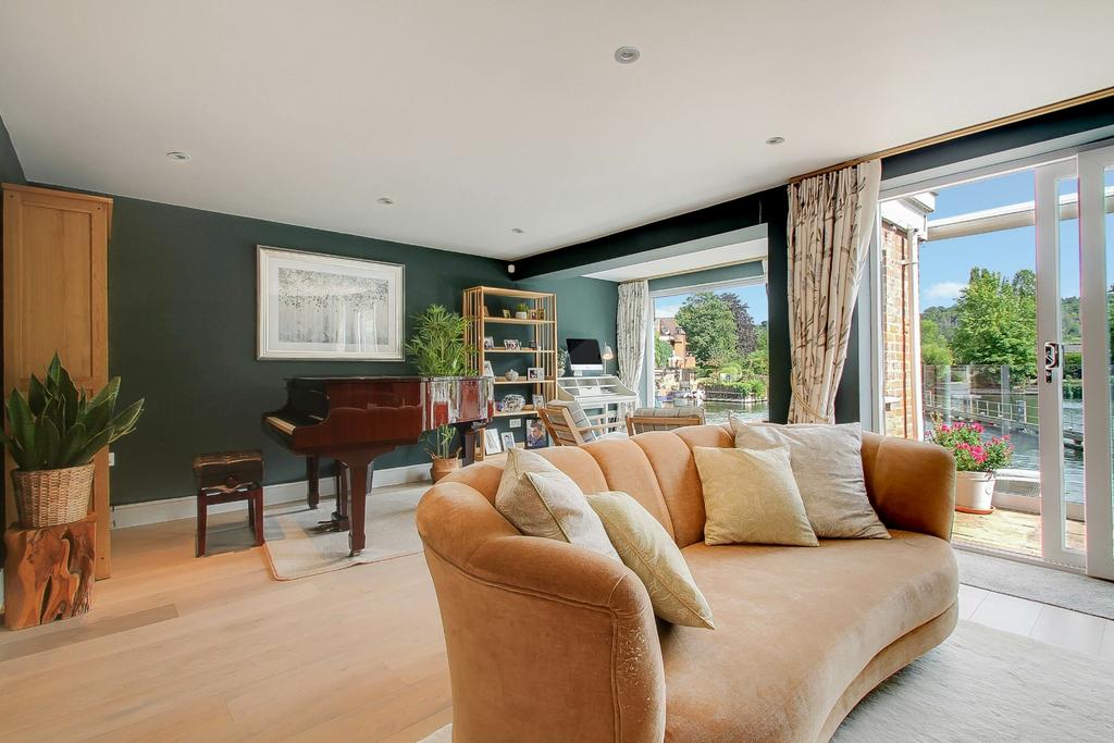 Ground Floor: Light-Filled Reception & Practical Luxury, The expansive ground floor reception room is a true showpiece — designed to impress while remaining inviting. This versatile space accommodates a grand piano, reading nook, TV lounge, and a desk area, all anchored by a stylish gas-fuelled wood-burning stove. Floor-to-ceiling windows capture the ever-changing river views and open onto a large south-facing terrace, perfect for entertaining or enjoying quiet reflection by the water.
