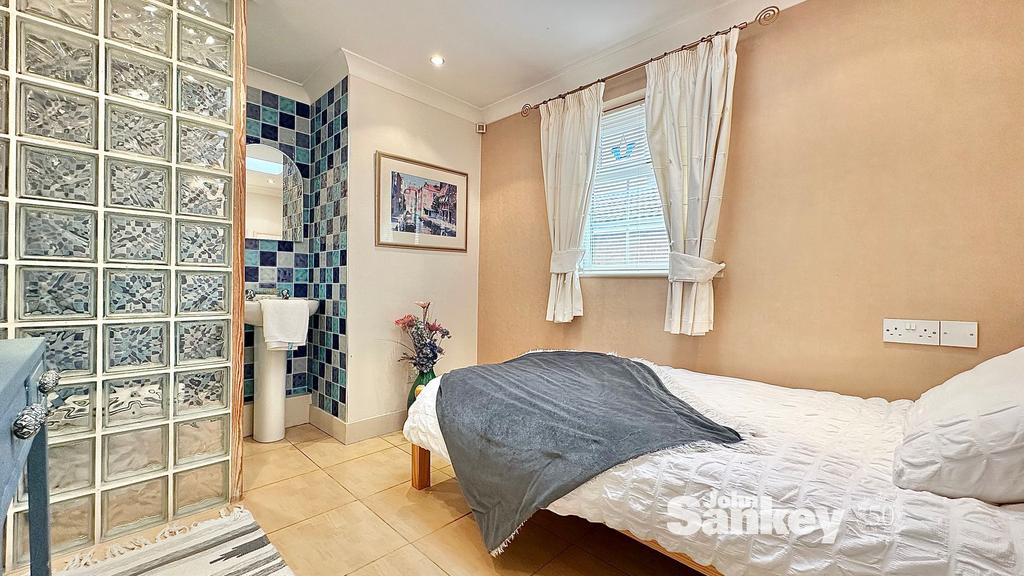 Fully tiled and featuring a mains-fed shower, vanity sink, and low flush WC. Glass panelled walls add a contemporary touch, and the en suite is lit by spotlights for a bright, clean feel.