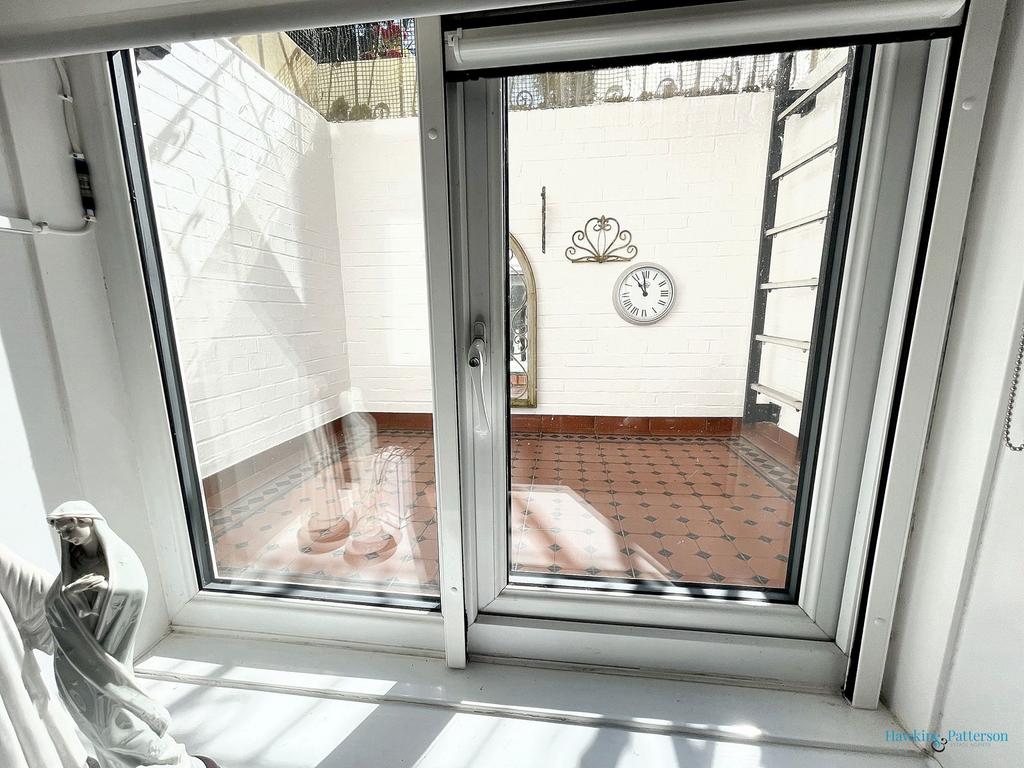 Feature arched ceiling, Karndean flooring, full length fitted wardrobes with sliding mirrored doors, radiator and double glazed window overlooking the tiled patio with fire escape ladder.