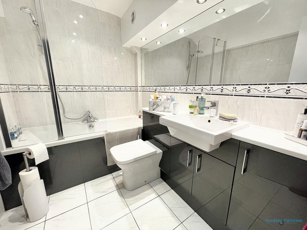 Refitted white suite with WC, wash basin, panelled bath with mixer tap and shower head. Feature tiled walls and flooring, fitted gloss fronted storage units, radiator, mirror, extractor and downlights.