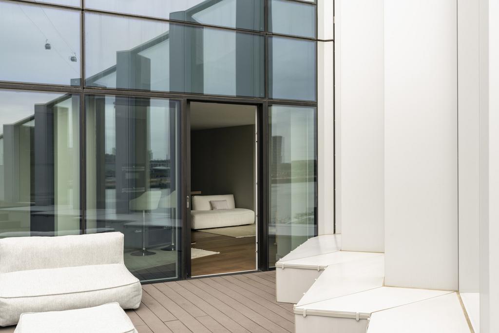 This beautifully designed home offers just over 950 sq ft of living space enhanced by floor-to-ceiling windows that flood the interiors with natural light. The open-plan reception area leads directly onto a large private roof terrace with sweeping views of the River Thames.