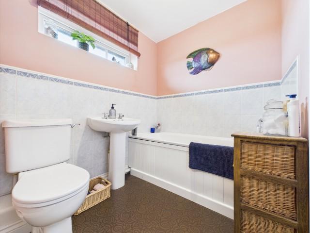 Family bathroom with white acrylic bath and mixer tap, matching pedestal wash hand basin and wc and a window.