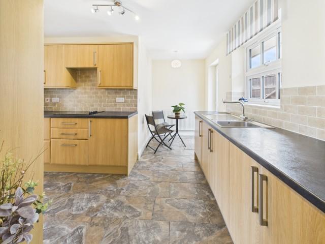 A great range of wall and floor units with complimentary prep surfaces. Built in fridge freezer, dish washer, ceramic hob, electric oven, microwave. Overlooking the rear.