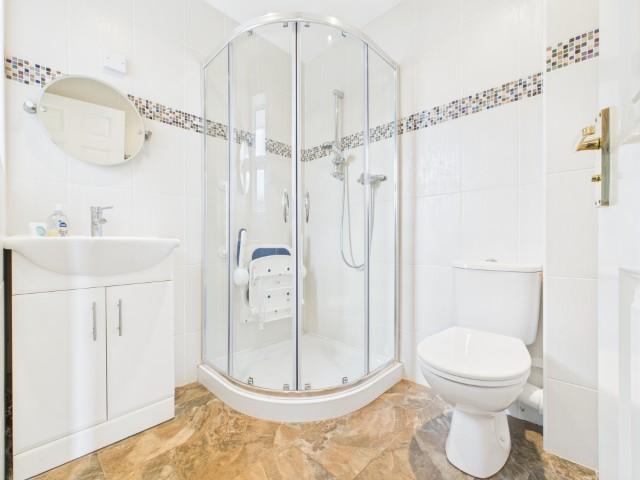 With white suite, mains shower in cubicle.