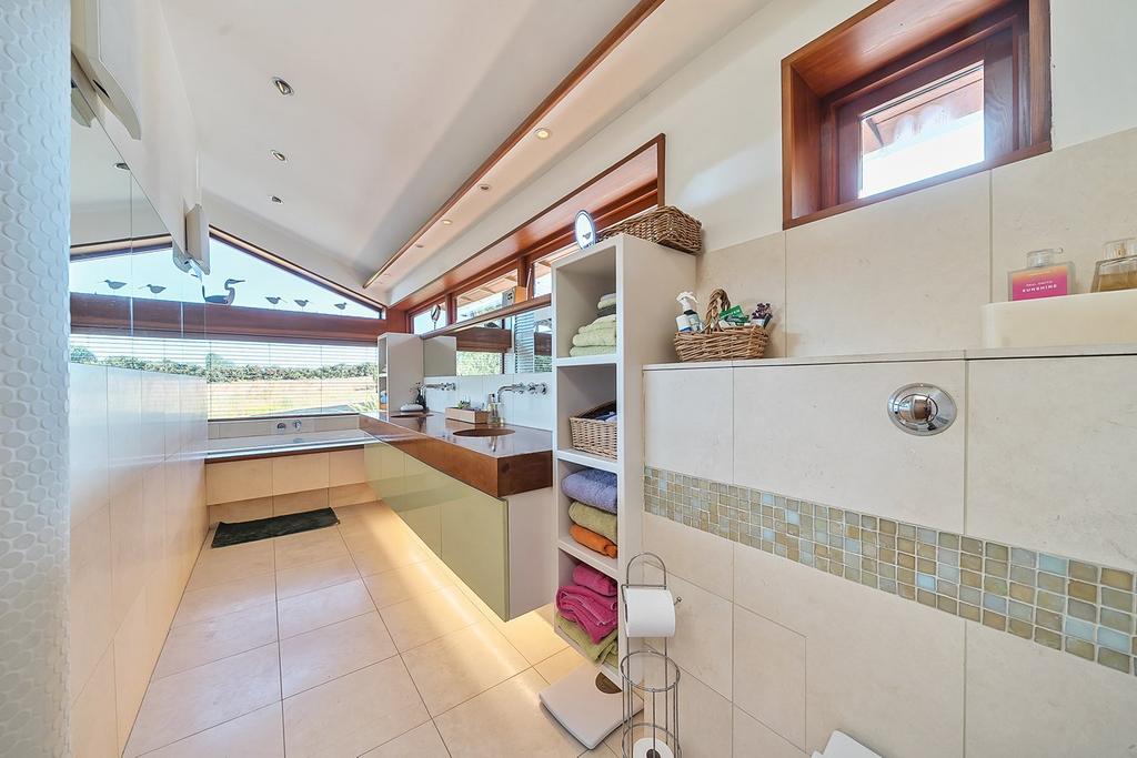 Outdoor living is at the heart of Hillside Farm. Multiple alfresco dining spaces are positioned throughout the grounds, offering both sun-soaked terraces and shaded nooks. A wooden walkway extends from the main house to a remarkable covered seating area an architectural feature in its own right designed for entertaining or quiet contemplation while enjoying uninterrupted views across the surrounding landscape.