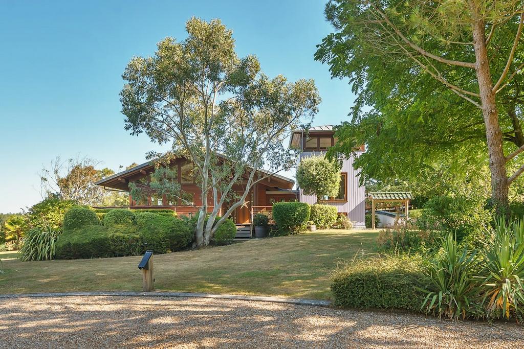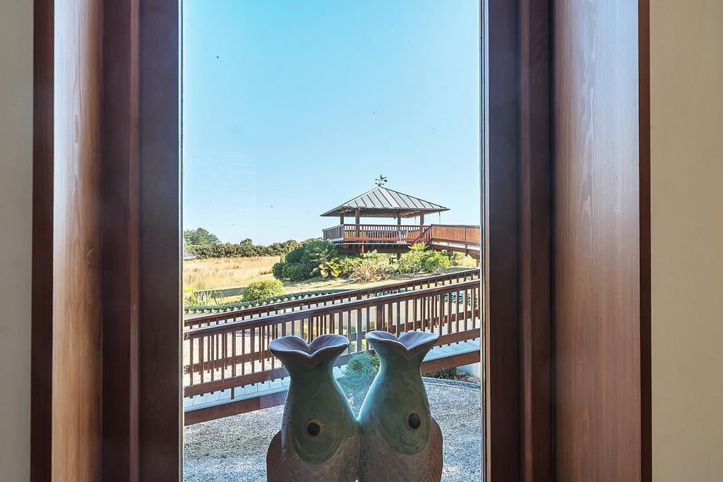 For moments of reflection and calm, a Japanese-inspired garden features tranquil water elements and carefully curated plantings that echo the home’s architectural ethos. A wooden deck wraps around the property, offering multiple elevated vantage points from which to enjoy the far-reaching views, perfect for morning coffee or evening drinks.