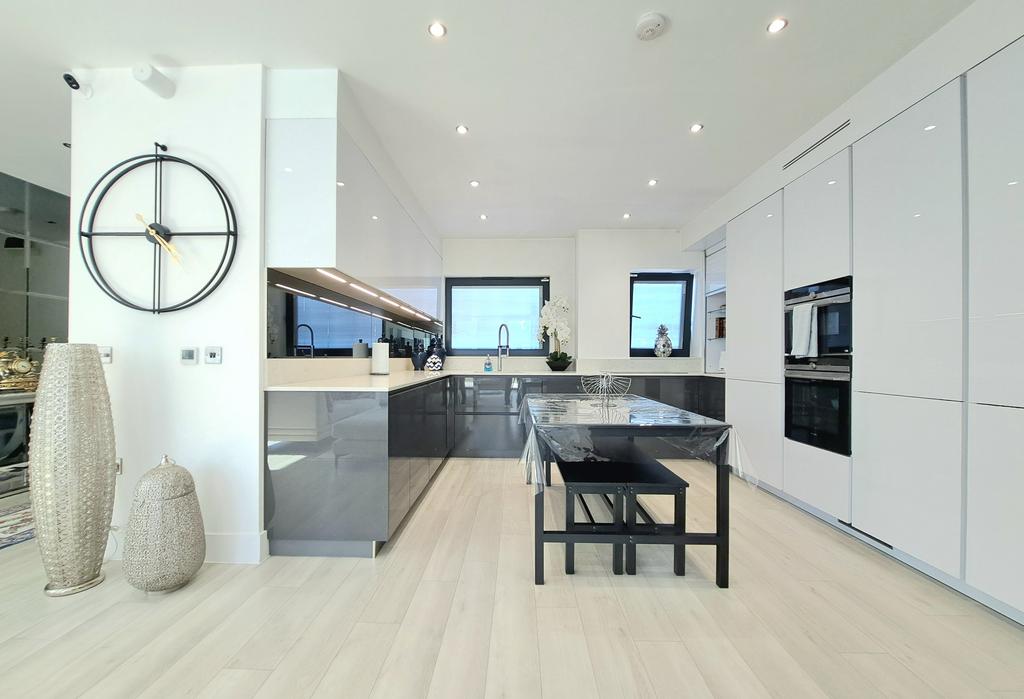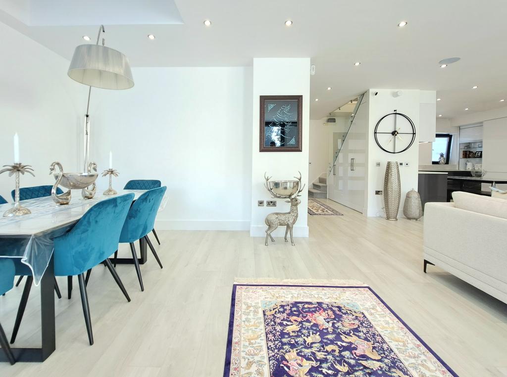 The ground floor is a spectacular open-plan expanse, where living, dining, and kitchen areas flow seamlessly together under abundant natural light from the expansive open-space, skylights and bi-folding doors. A sleek, fully integrated kitchen with premium surfaces serves as the heart of the home, perfect for entertaining or everyday family life.