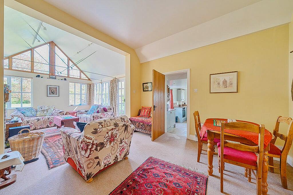 25' 5" x 11' 9" (7.75m x 3.58m) a room with a part vaulted ceiling, sealed unit double glazed cathedral like windows to the front, sealed unit double glazed multi paned windows which wrap round front and side, chimney breast with a fireplace with exposed brickwork, oak bressumer, fitted wood burning stove, raised stone hearth, LED down lighting, hatch to a loft storage area, thermostat control for the central heating, doors lead into the kitchen and into bedroom 2.
