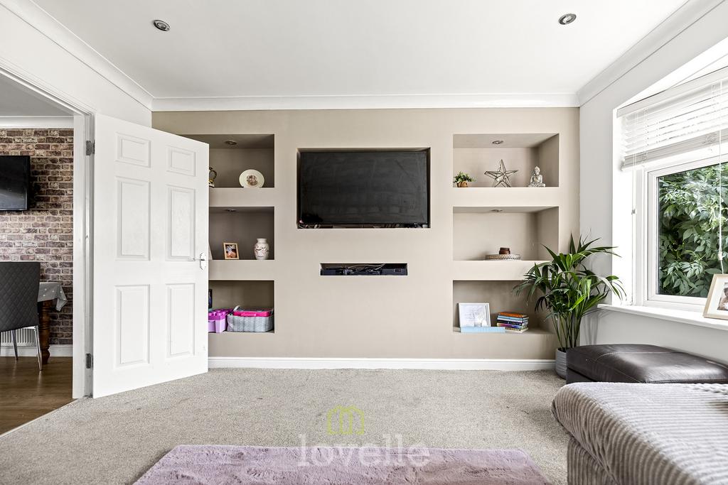 Externally, the former garage has been cleverly converted into a versatile room, currently used as a home office/gym. The rear garden is mainly laid to lawn, with a patio area adjoining the house – perfect for outdoor dining and relaxation. To the front, a long driveway provides ample off-road parking, complemented by a lawned area and mature planting with shrubs and bushes.
