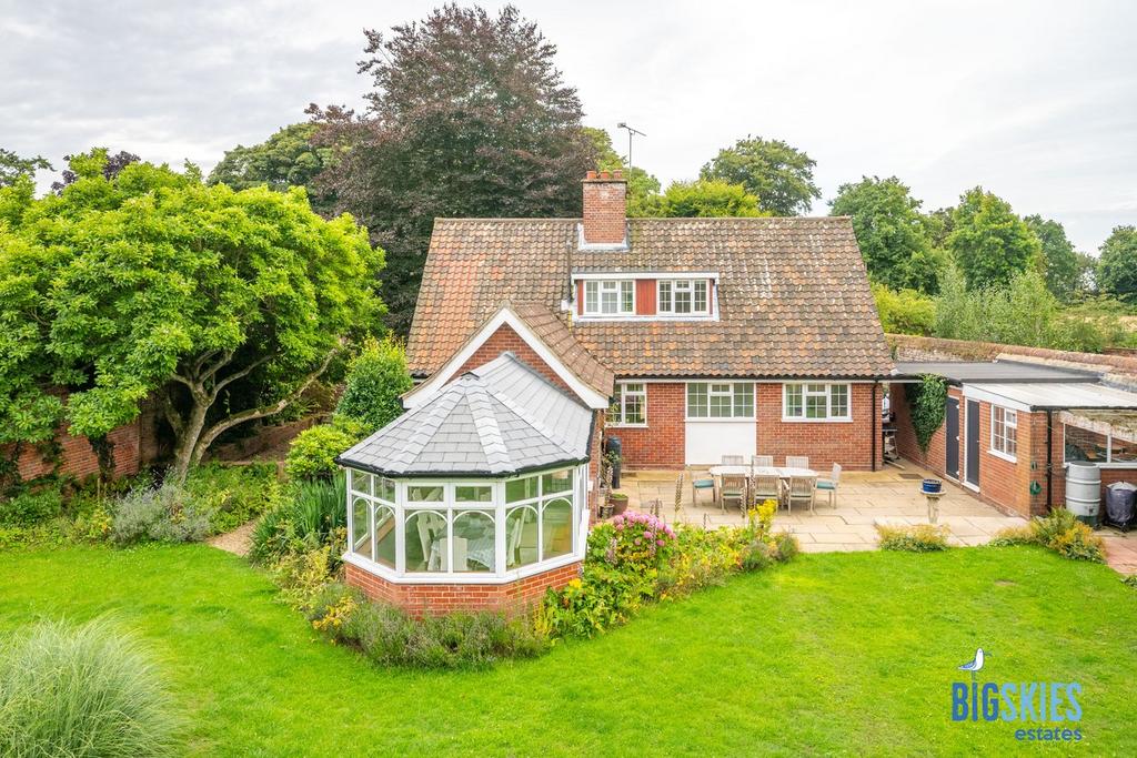 The house is set back from the road with brick and flint walls either side. The front drive is part laid to gravel and lawned and with mature shrubs and trees. The rear garden is accessed from both sides of the house and opens out into a paved area directly outside the garden room, which is perfect for al fresco dining. With many mature beds, trees and shrubs, the remainder of the garden is lawned and provides the ideal setting for enthusiastic gardeners.