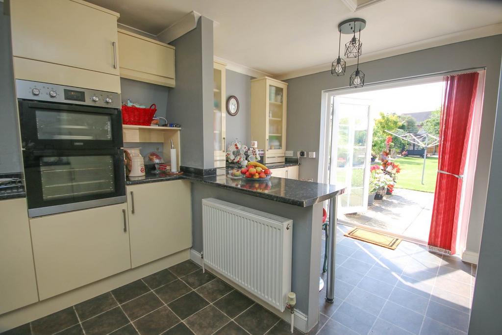 6.71m x 3.74m max, narrowing to 3.55m (22' 0" x 12' 3" max, narrowing to 11' 8") Worktops with sink unit and mixer tap, cream coloured cupboards and drawers under, heating controls, Worcester boiler, 4 ring Zanussi hob with stainless steel extractor over, integrated fridge and freezer, matching wall units, eye-level Zanussi double oven with locker over and cupboard under. There is a matching breakfast bar with further adjoining worktop have integrated washing machine and dishwasher under, 2 matching glazed display cupboards over with drawer below, broom cupboard, loft access, UPVC double glazed door to side, tiled effect flooring, UPVC double glazed doors leading out on to the rear terrace.