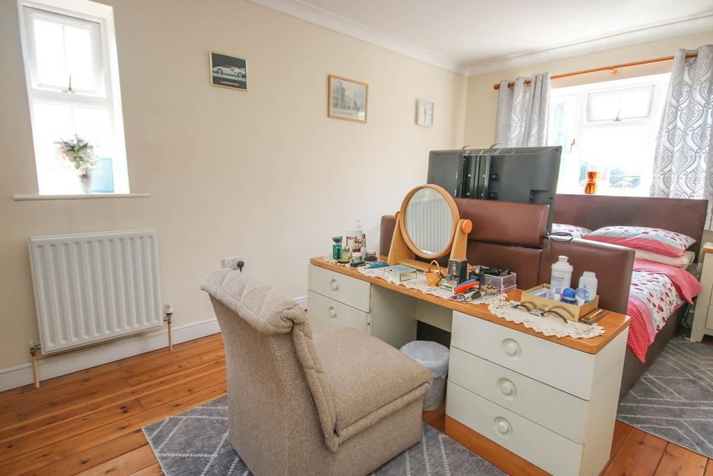 4.48m x 2.80m into window recess (14' 8" x 9' 2" into window recess) Window overlooking rear garden, radiator, fitted wardrobes with a dressing table area with cupboard above.