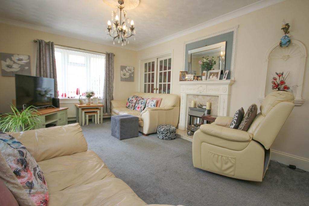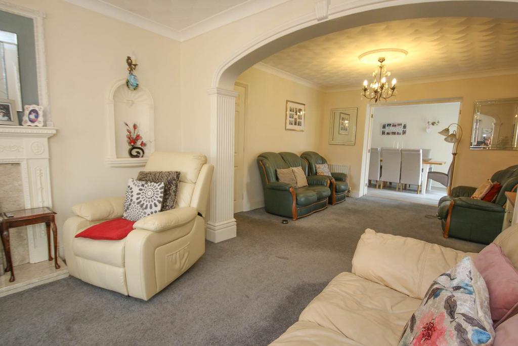 9.16m x 3.52m (30' 1" x 11' 7") Decorative fireplace with coal-effect fire, marble inset and marble hearth, 2 ceiling roses, window to side, UPVC patio doors into conservatory, 2 radiators, glazed double doors into the dining room/family room and glazed door into the kitchen/breakfast room.