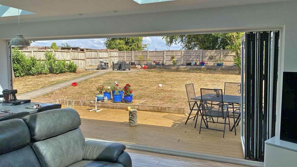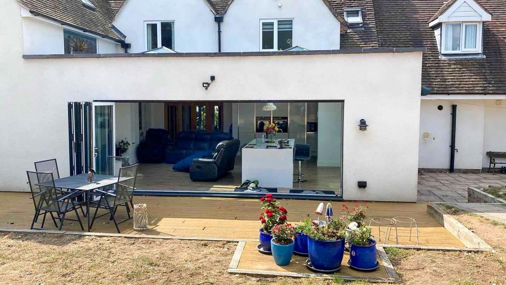 To the front, a newly laid private driveway provides parking for several vehicles and leads to the garage front door, with gated side access to the rear garden. The rear plot offers a fantastic space for both families and entertaining, featuring a large lawn, patio areas, and uninterrupted countryside views.