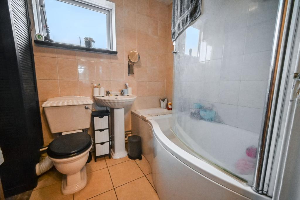 Bathroom: 6’6’’ (1.68m) x 7’10’’ (2.40m) Fitted with a white suite comprising P-Shaped panelled bath with electric shower unit & side screen, pedestal wash hand basin, low level WC, chrome heated towel rail, tiled walls & flooring, built in floor to ceiling cupboard and double glazed opaque window to rear.