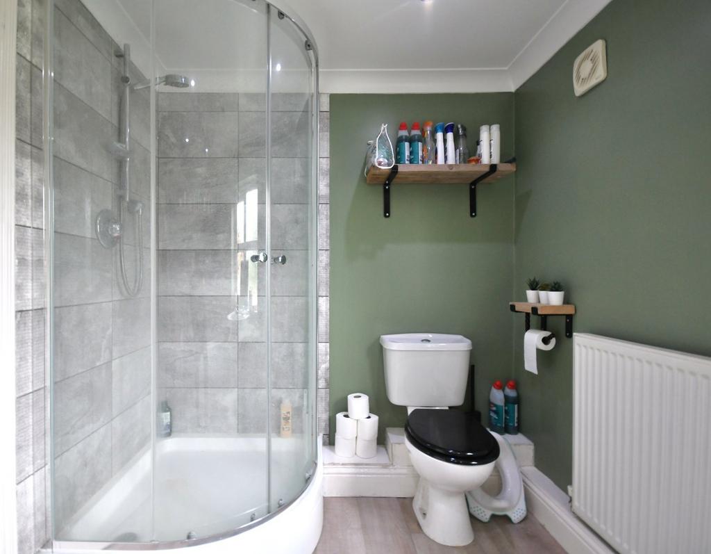 6' 06" x 7' 05" (1.98m x 2.26m) vinyl flooring, window to side aspect, quadrant shower cubicle with thermostatic shower over, towel radiator, hand basin, low level flush w/c