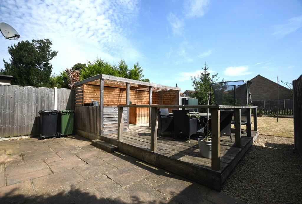 The property is approached via a brick-weave driveway, providing generous off-road parking. To the rear, you’ll find a private, enclosed garden, perfect for outdoor living. A decked seating area, partly covered for year-round use, creates an inviting space for entertaining, while the remainder of the garden is laid to lawn and complemented by a garden shed. The secure fencing ensures both privacy and a safe environment for children or pets.