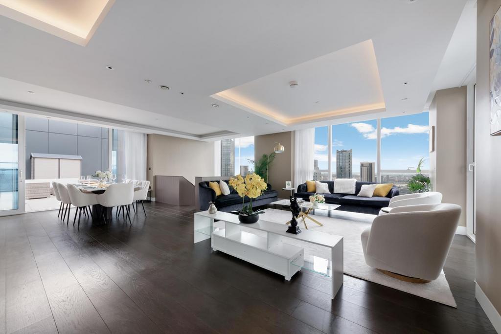 Upon entry, you're welcomed into a spacious open-plan living area, where floor-to-ceiling windows showcase sweeping views across London’s skyline — stretching from Canary Wharf to the River Thames. The interiors are bathed in natural light, highlighting elegant finishes such as premium hardwood flooring and contemporary fixtures.