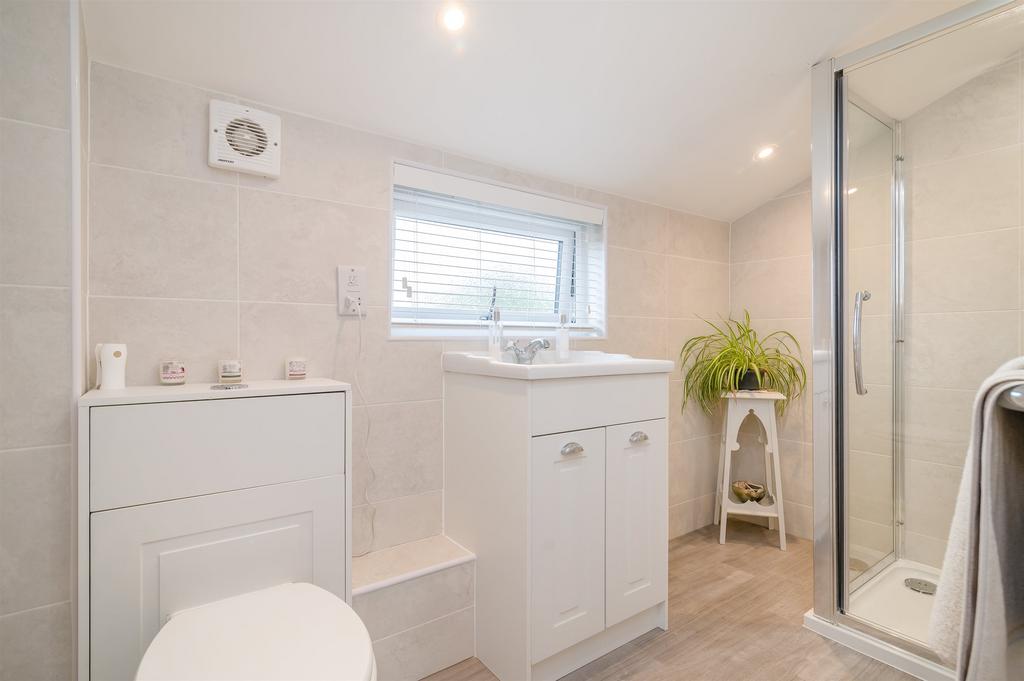 The ground-floor bathroom has been recently refitted to a high standard, featuring fully tiled walls, a panelled bath, a separate walk-in shower cubicle, WC, and a vanity wash hand basin with storage beneath