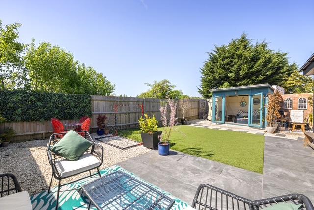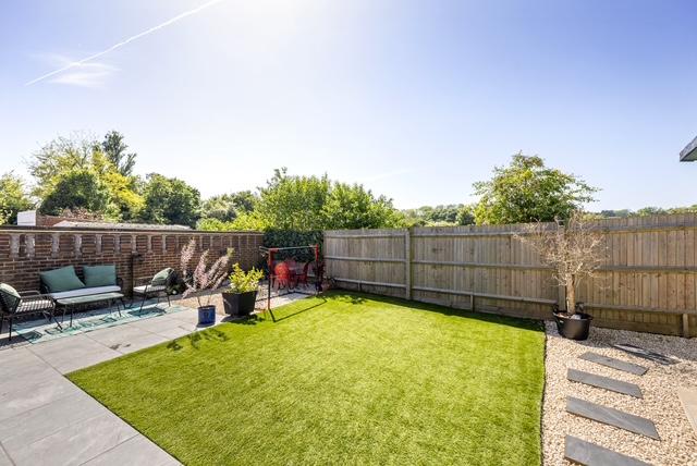 REAR GARDEN: West facing backing directly onto Greenleas Park, paved patio area and artificial lawn, summer house (9’8” x 7’10”) with light and power points, side access.