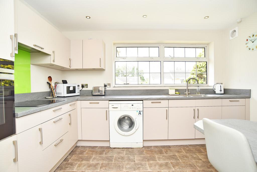 With a range of fitted modern units with induction hob, integrated fridge / freezer, dishwasher and oven, with space and plumbing for further appliances.
