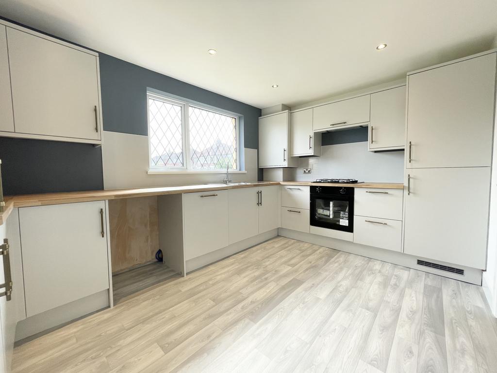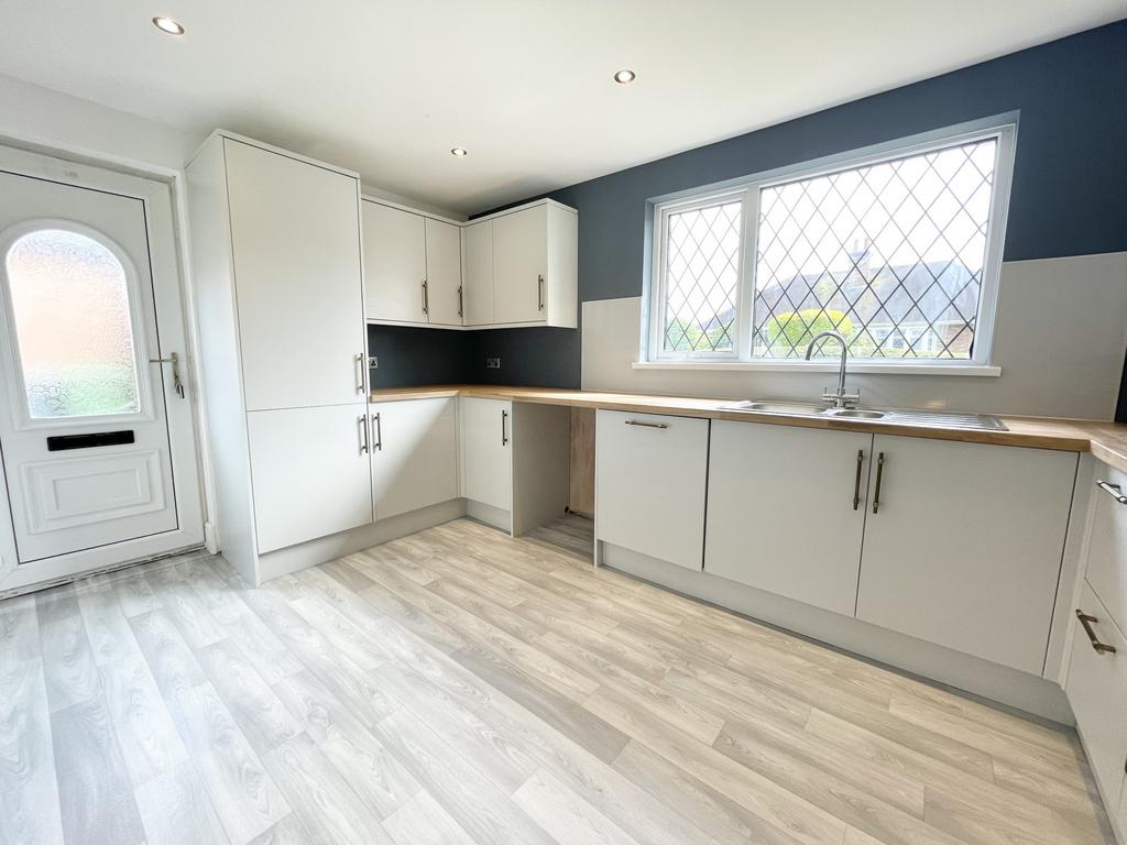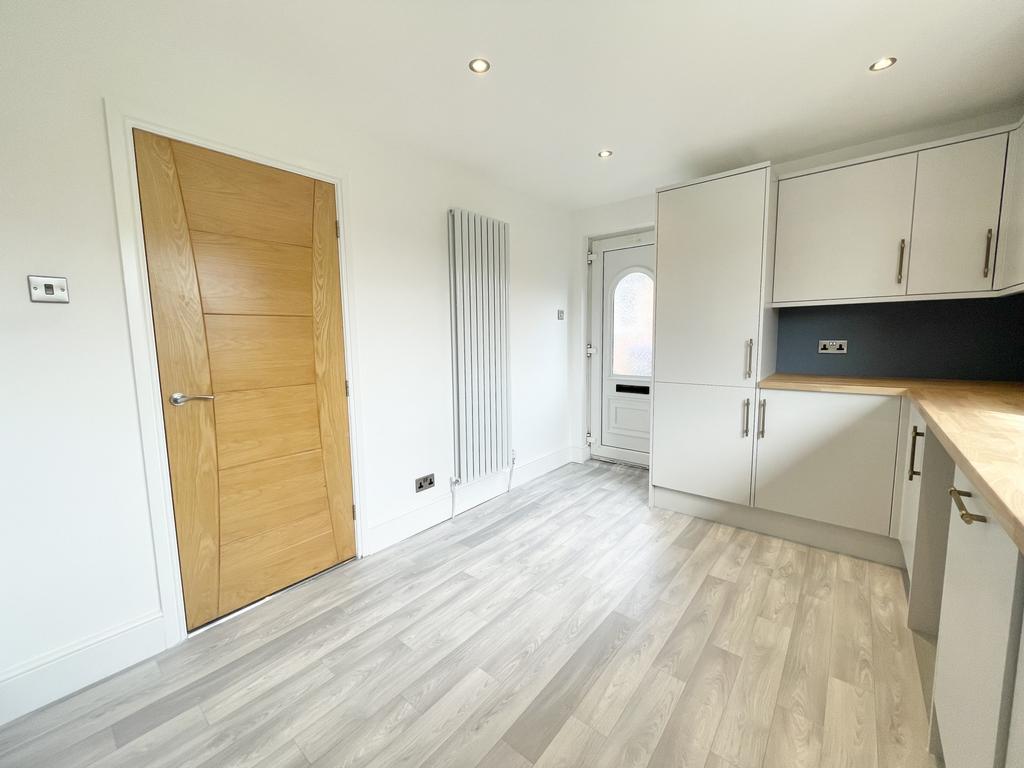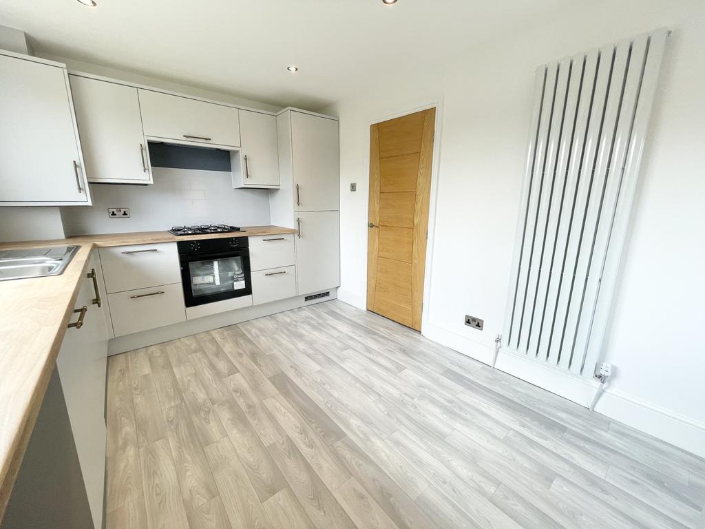 Modern fitted kitchen with a range of wall and base units with complementary work surfaces, integrated electric oven, four ring gas hob, integrated fridge freezer and dishwasher, space for washing machine, sink with mixer tap, splash back, radiator and cupboard housing newly fitted combi boiler. UPVC double glazed window and door.