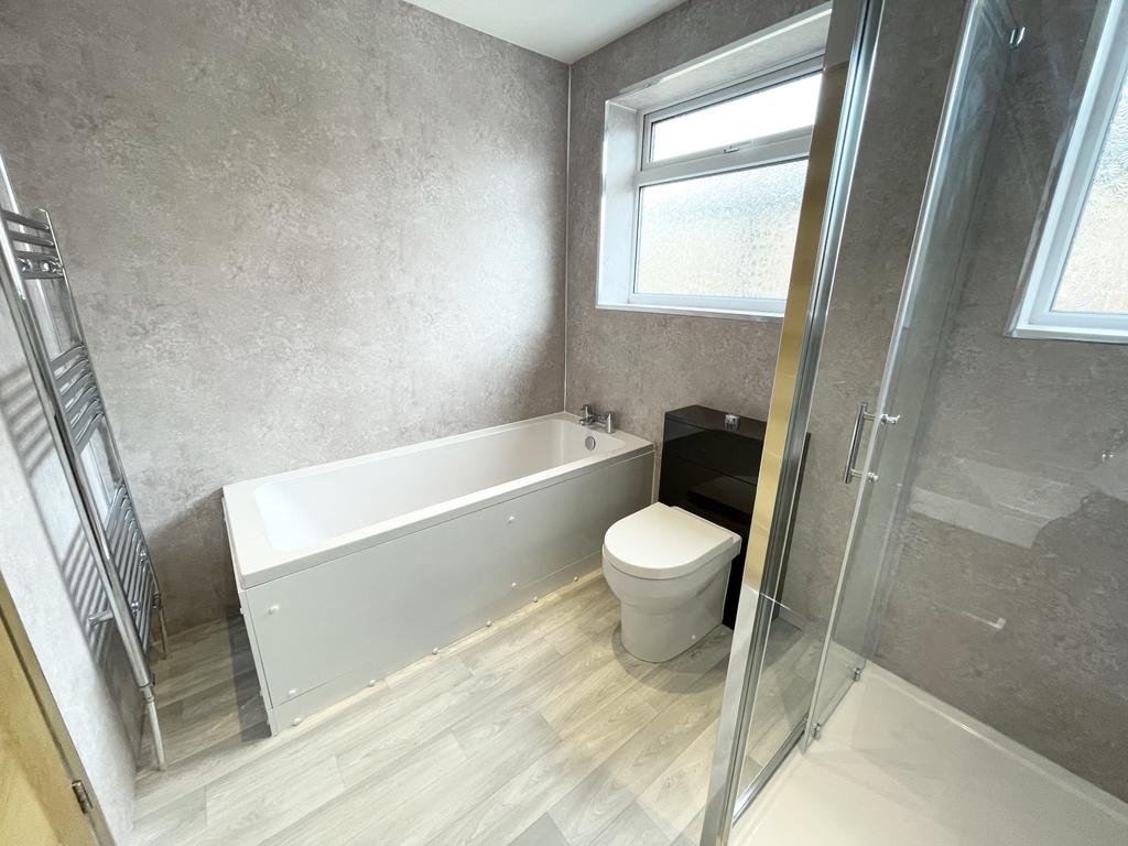Modern fitted four piece suite briefly comprising: Bath, shower cubicle, low flush w.c, wash hand basin with mixer tap and heated towel rail. Two UPVC double glazed windows.