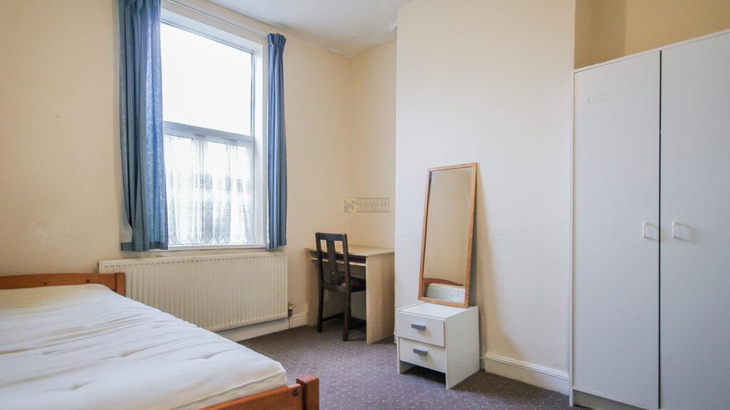 The property showcases a quiet and decently sized kitchen, featuring a washer-dryer for occupant convenience. Each bedroom then features a standard double bed, a desk area a chest of drawers, and a cupboard for storage. All rooms are also equally sized, and feature wood-style flooring, and large windows, giving each room a relaxingly cool and airy quality. There is also one shared, marble-styled bathroom for occupants as well, featuring a bathtub.