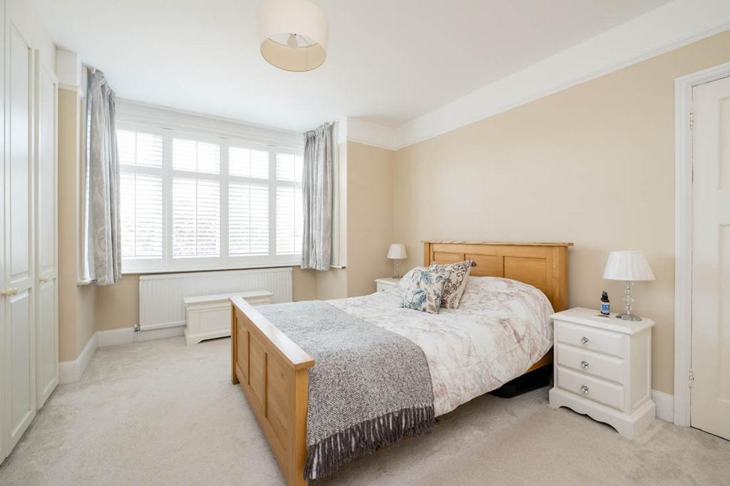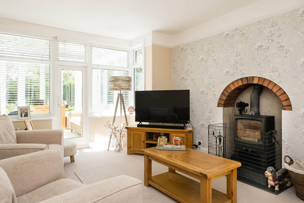 On the ground floor there are five spacious reception rooms. The first to the right is a grand sitting room, currently used as a play room/ additional bedroom. This room is dual aspect and has an attractive square bay window to the front elevation. Behind this is the main living room, with a pretty, decorative arched brick fireplace housing a wood-burning stove: a cosy feature to enjoy on winter evenings. From here, a glazed door leads into the sun room, with wrap-around views of the garden. A further set of French doors lead out to the patio.