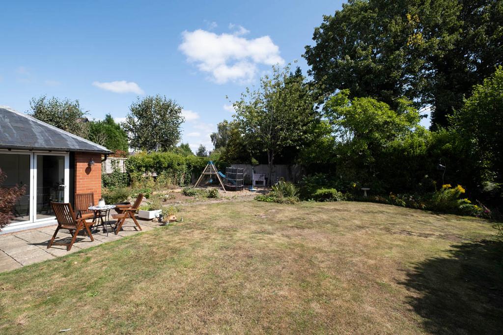 The rear garden is large with a central lawn flanked by flower borders, mature trees and shrubs. There is a children’s play area and 3 garden buildings hidden behind a screen of trees. There is also a patio directly behind the property on which to enjoy evening drinks and summer barbecues.